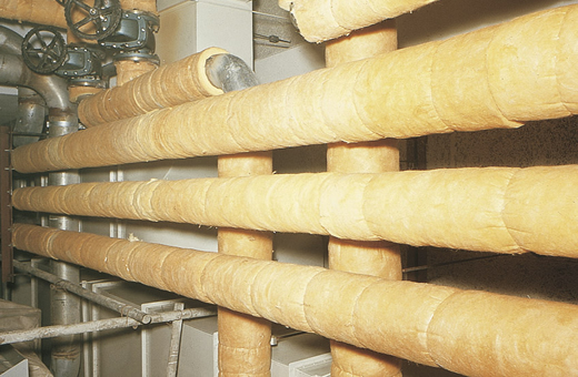 オフィスビルやマンション、工場などの冷水・温水管、給湯・蒸気管の配管の保温・保冷にはグラスウールが使われています。プラント用大口径配管や空調システムの鉄板ダクトの断熱・吸音にもグラスウールが使われています。