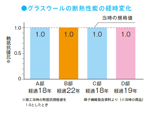 18年~22年経ってもグラスウールは継時変化が見受けられなかった。