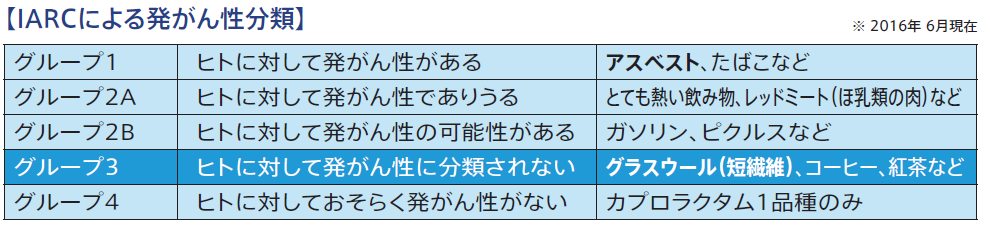 グラスウールは国際がん研究機関(IARC)からコーヒーや紅茶と同じグループ3に分類されている。